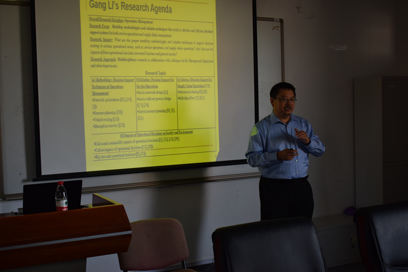 On September 6, 2017, at the invitation of the Department of Logistics Management of the Business School, Dr. Li Gang from the Department of Management of Bentley University gave an academic exchange to BTBU Meeting Room 621 of the Multiple-Purpose Building of Fucheng Road Campus from 10:00 am to 12:00 pm. The lecture was hosted by Mr. Zhang Hao. Yang Haoxiong, Associate Dean of the Business School, Ms. Sun Hongxia, Ms. Zhang Linlin, Mr. Zhao Chuan and postgraduate students of the Business School attended the lecture, which was entitled “Models and Algorithms for Service Network Design and Reduction”.In the lecture, Dr. Li Gang pointed out that the sustainable development of the service industry was getting more and more attention. The word “service” in the topic was not only a breakthrough but also an innovation in the research of supply chain. The whole lecture was relaxing yet lively. Dr. Li Gang’s fluent analysis, clear experimental logic, and humorous manner of expression won warm applause from the faculty and students in attendance.