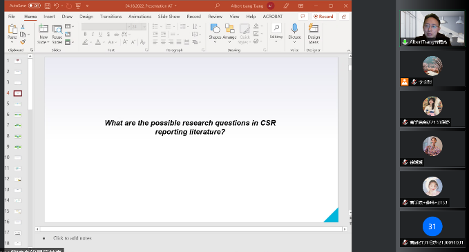 On April 18, 2022, Business School held the first Young Scholars Forum on Academic Reports of Accounting and Finance. We werehonored to invite Professor Zeng Xiaoliang, a PhDSupervisor from the Hong Kong Polytechnic University to deliver an online academic lecture themed on CSR Reporting Research Framework for our teachers and students from Department of Accounting and Department of Finance of the Business School.