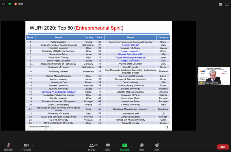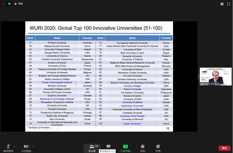 6月11日北京时间晚9点,2020年世界最具影响力前100高校排名(The World's Universities with Real Impact (WURI) Ranking for 2020)发布会采取Zoom在线会议的方式成功举行,主会场在韩国首尔。会议由4个全球机构组织发起:汉萨大学联盟(HLU)、瑞士日内瓦联合国训练研究所(训研所)、瑞士卢加诺富兰克林大学泰勒研究所(TI-FUS)和韩国首尔国家竞争力政策和战略研究所(IPSNC)。会议由三个部分组成,第一部分,世界最具影响力的大学排名项目组介绍排名机制,由世界最具影响力的大学排名项目负责人MOON Hwy-Chang教授发布2020年世界最具影响力的大学排名名单。第二部分,世界最具影响力的大学排名的工作人员和评委将对他们评审的创新项目给出总体评价。第三部分,部分申请高校通过简短的视频片段展示其的创新项目。赌博app下载 申请小组成员以及学校国际交流处马雪娇副处长参加了会议。
