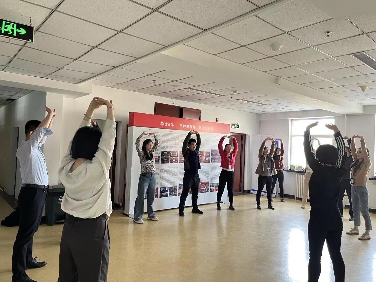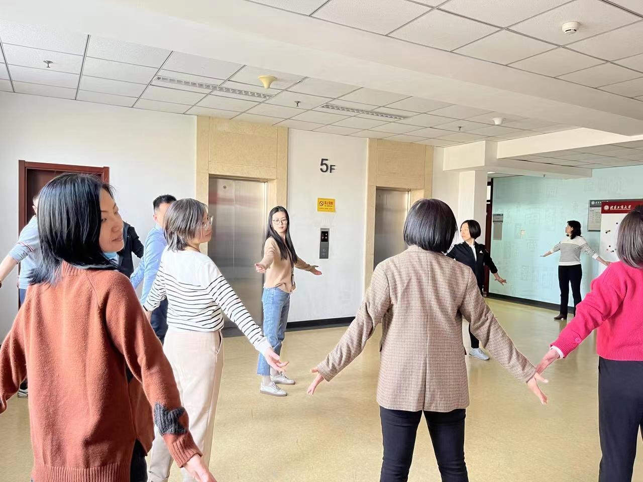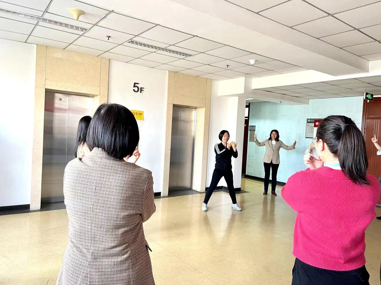 阳春三月,赌博app下载 教师利用中午休息时间开展八段锦练习。老师们跟随着严欢老师的示范和指导,伴随着舒缓优美的音乐,一招一式练习,大家开步屈膝、仰头翻掌、两手攀足……大家学习热情高涨,练习踊跃。