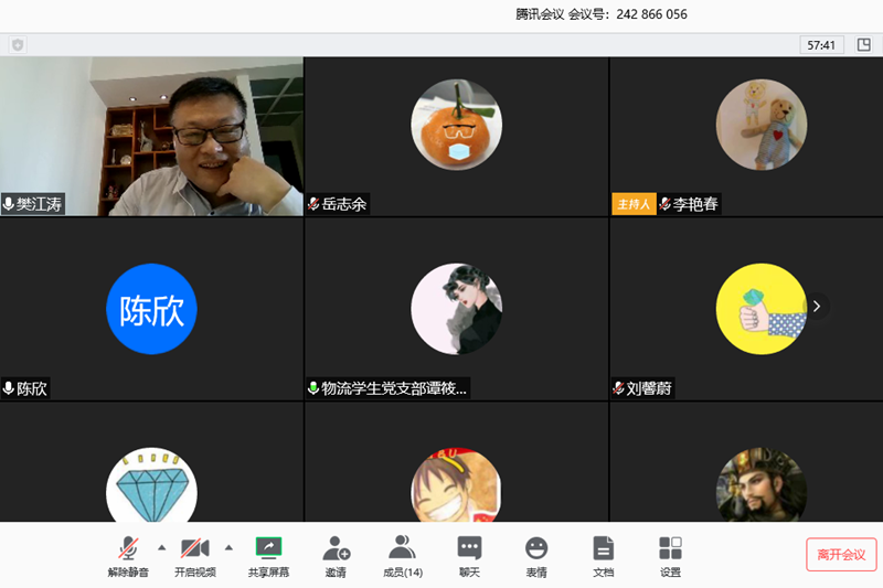 樊江涛老师在两次视频会上结合疫情阻击战做了党课教育,他用一个个事例数据对比了中外新冠肺炎疫情防控工作,引导大家深入理解党的十九届四中全会关于推进国家治理体系和治理能力现代化的精神,深入理解总体国家安全观、人类命运共同体等“中国理念”,深入理解中华优秀传统文化和党的教育方针对于国民教育的重要性,号召党支部团结带领党团员冲锋在前,再接再厉,用实际行动向打赢疫情阻击战交出满意的答卷,并结合专业就疫情对产业结构、消费习惯、文化生活方式带来的影响开展学术性研讨。他也提醒大家要清醒地看到西方反华势力利用疫情对我国的丑化抹黑,在意识形态领域对崛起的中国极尽所能地围追堵截、打压渗透,引导大家认识意识形态斗争的长期性和艰巨性,牢固树立“四个意识”,坚定“四个自信”,坚决做到“两个维护”。