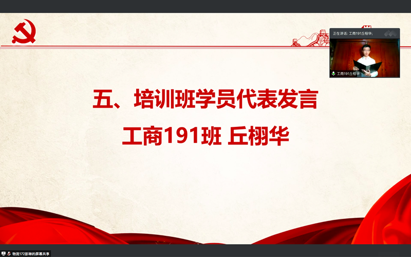 工商181蔡鑫鹏、工商191班丘栩华同学分别代表分党校兼职辅导员、学员代表发言,他们表示将积极发挥模范带头作用,严格遵守党校各项管理规定,认真学习党的理论知识,以优异的成绩完成学习与实践任务。