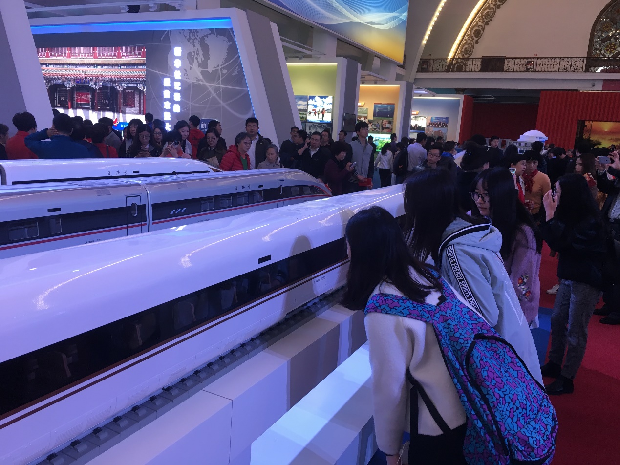 在参观到“复兴号”列车时,学生党员于小婷发出感慨:“复兴号”列车速度更快了、舒适度更高了、安全性能越来越好了,五年来科技的进步让我回家的旅途更加的畅通和便利了。