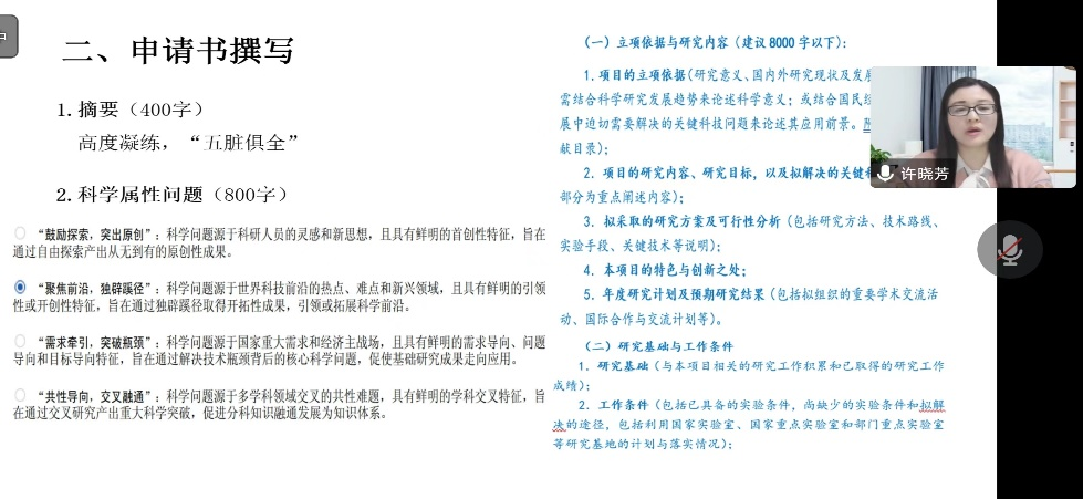 第二位是许晓芳教授,她主持了国家自然科学基金面上项目,并且是十九届六中全会国家社科基金重大项目子课题负责人,近年来在《会计研究》、《金融研究》等重量级期刊发表多篇学术论文,同时是北京工商大学教学名师,是优秀的党员老师代表。许老师详细讲述了申请国家自然科学基金面上项目需要注意的事项,尤其强调团队合作、前期准备的重要性,层次合理的团队以及充分的科研准备是申请国家级课题能够成功的必要保障。许老师的珍贵分享有助于各位老师在进行国家自然科学申请的时候迅速抓住要点,使大家收获颇多。
