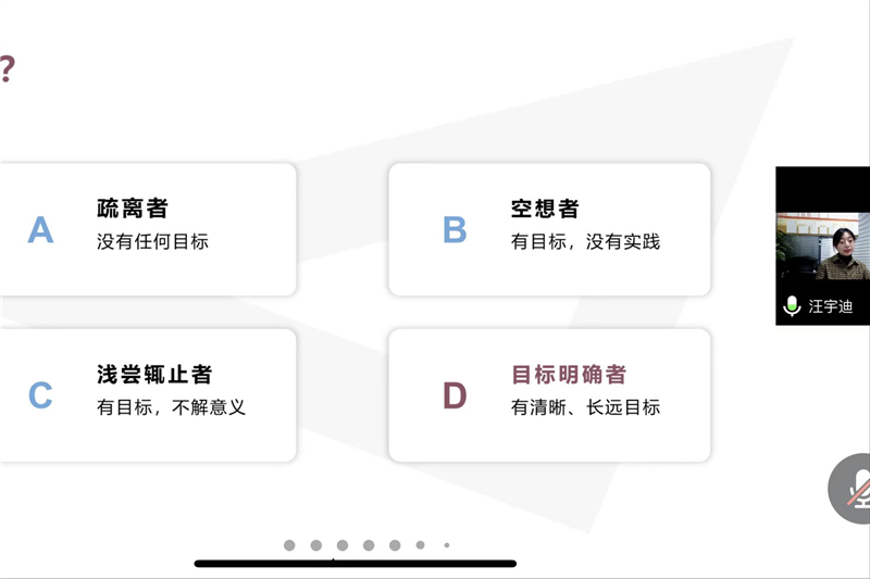 工商管理专业2010级校友汪宇迪现任五矿发展股份有限公司党委组织部(人力资源部)经理,她结合自己多年的职场经历,为同学们带来HR视角下的职业生涯规划讲座。她从自己的大学学习、学生工作、求职历程等内容讲起,有效拉近了和同学们的距离。结合身边的真实人物,她为大家分析了疏离者、空想者、浅尝辄止者、目标明确者等四种不同目标状态的群体,引导同学们自我反思和树立长远目标。在讲座过程中,汪宇迪将职场故事和人生经历娓娓道来,为同学们提供了解自己、提升认知、进行高质量的校内实践和校外实习、提升学历、打磨简历等实用建议,她在课堂上非常注重与同学们的积极互动,充分调动了同学们上课的积极性,使讲座成为一场集干货和趣味于一体的沉浸式学习体验,同学们收获颇丰。