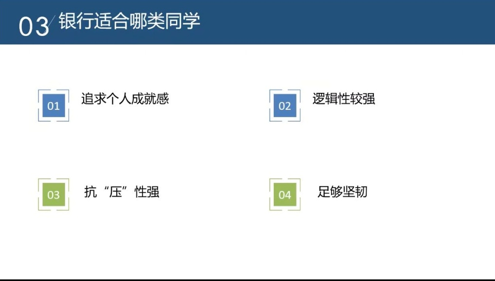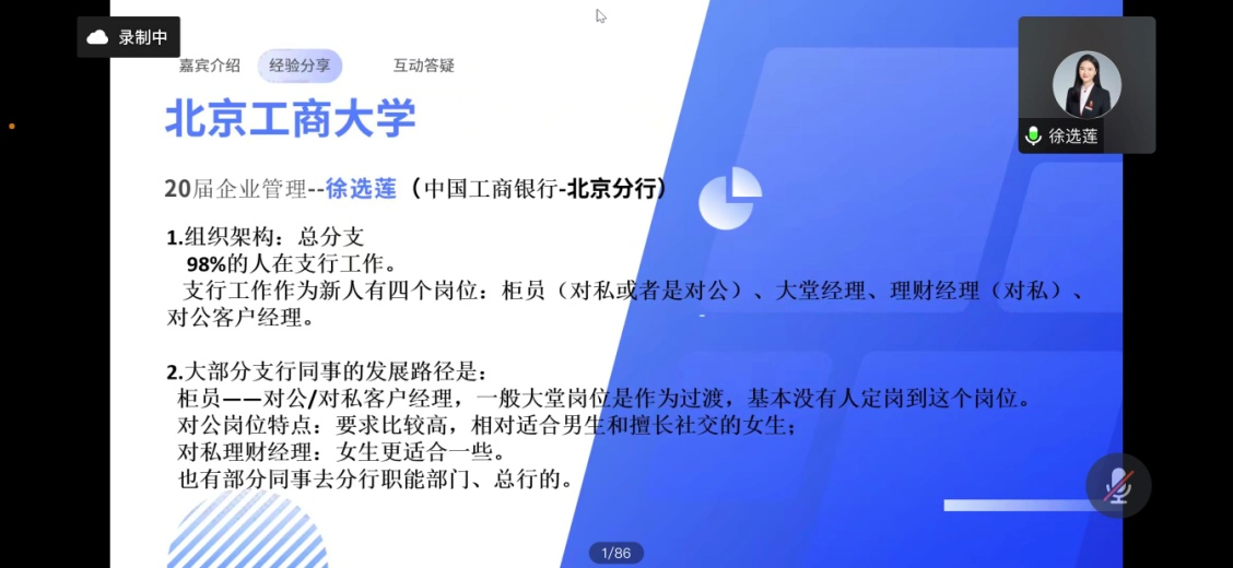 第二位分享的是王嘉铭,赌博app下载 20届MPAcc研究生,现就职于中国工商银行北京分行。王嘉铭通过秋招进入工商银行,从柜员岗位做起,一年之后转岗到客户经理。这个岗位要和客户打交道,需要全面了解银行各方面的知识,同时要锻炼自己的情绪管理能力与抗压能力。他介绍到,银行偏好能吃苦、情绪较稳定的人,包容性更强,是较好的职业发展起点。