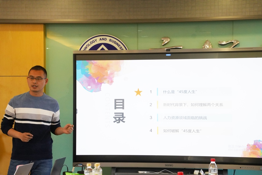 高慧孟分享的题目是:由“45度人生”引发的管理思考”。高慧孟毕业后曾在某咨询公司、阿里工作,一直专注于组织与人才发展、薪酬绩效。他主要针对当下90后、00后职业人群的特点,对如何破解45度人生的个人选择难题和管理难题谈了自己的看法。他对同学们的建议是无论选择怎样的自我发展路径,要做一个拥有积极、多元价值观、追求精神充实感的终身成长者。
