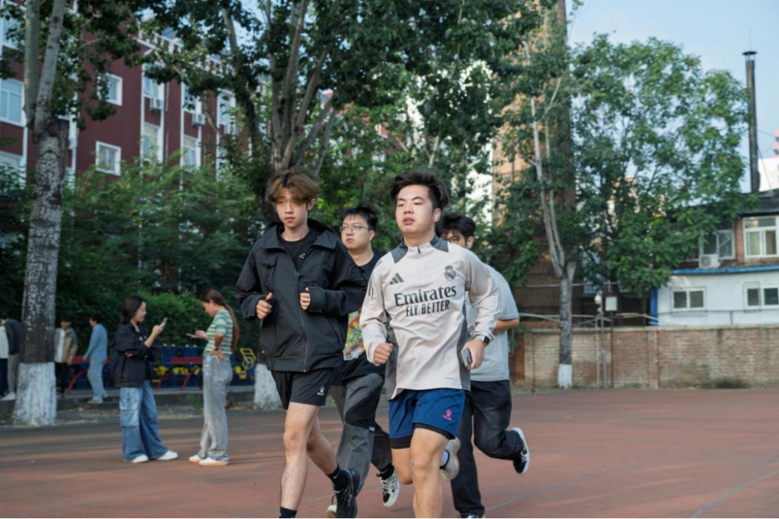 “来!咱们一起跑!”,同学们步伐坚定,朝气蓬勃,号声与脚步声交替,健康的作息,从今天开始!