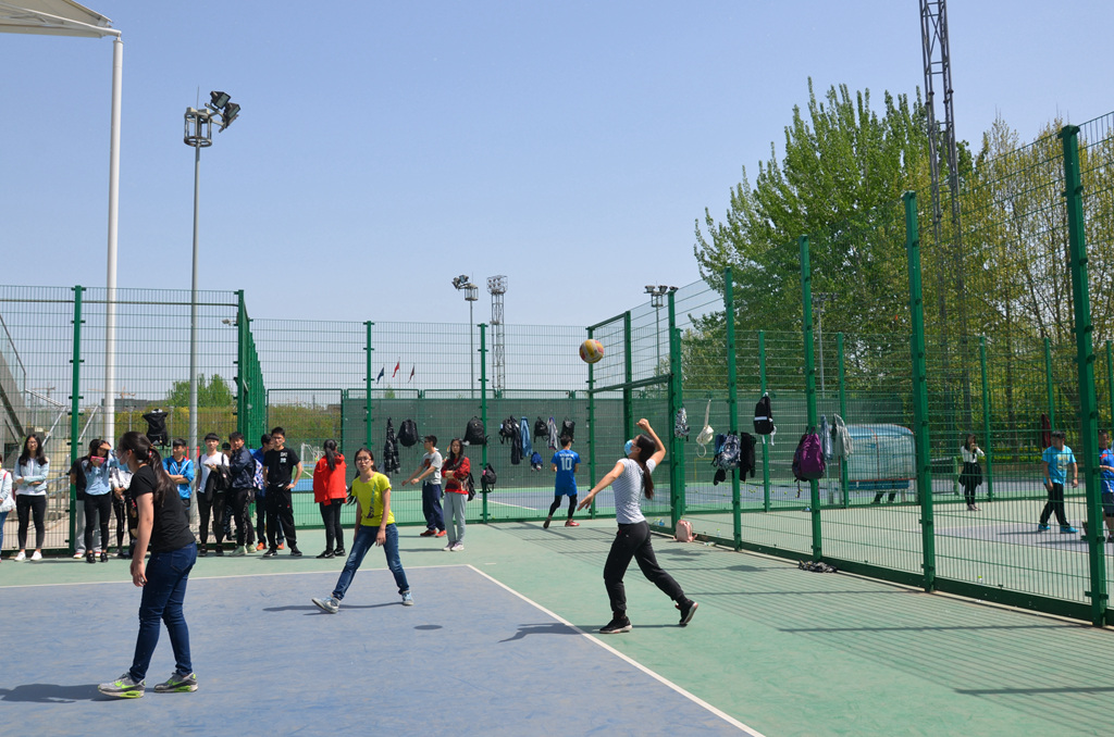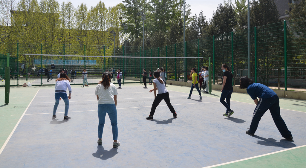 在图书馆一侧的排球场展开了女排第三、四名的角逐。