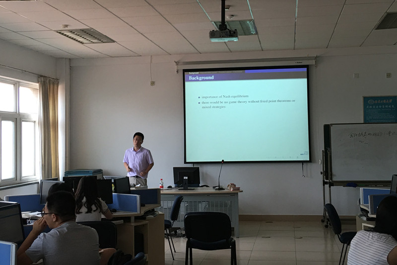 在讲座中,曹志刚老师指出超模博弈和位势博弈重要且有用,超模博弈与策略互补博弈相似,用生动的例子给大家介绍了策略互补和策略替代的概念。他指出超模博弈和位势博弈有很好的研究前景,目前研究的少,由于二者有很好的性质,且有很好的经济管理解释,在实际生活中有很多应用,十分重要。最后,学生积极向曹老师就相关问题展开讨论。一些同学还就自己的论文进行了讲解展示,曹老师提出了一些宝贵的意见和建议。他指出论文的选题要聚焦到一个点,切忌宽泛,使用的模型应讲清楚为什么适合这个研究方法,结论应明确清晰,同学们都受益匪浅。