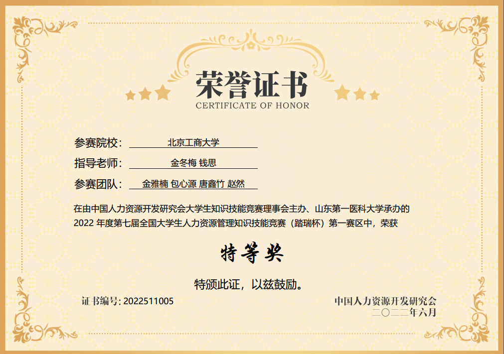 5月29日下午,由中国人力资源开发研究会主办的第七届全国大学生人力资源管理知识技能竞赛(踏瑞杯)(第一赛区)在线上举行。我校派出由人力201金雅楠、赵然、唐鑫竹、人力202包心源组成的代表队参赛,代表队在金冬梅、钱思老师指导和带领下,获得了第一赛区特等奖,成功晋级全国总决赛。