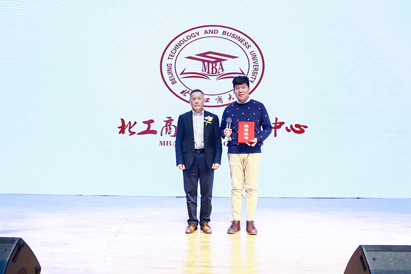 论坛现场,北京工商大学MBA LOGO震撼发布并由2013级MBA学员、logo设计者潘岳分享设计理念,北京工商大学副校长谢志华为其颁发“最佳设计者”证书,并合影留念。