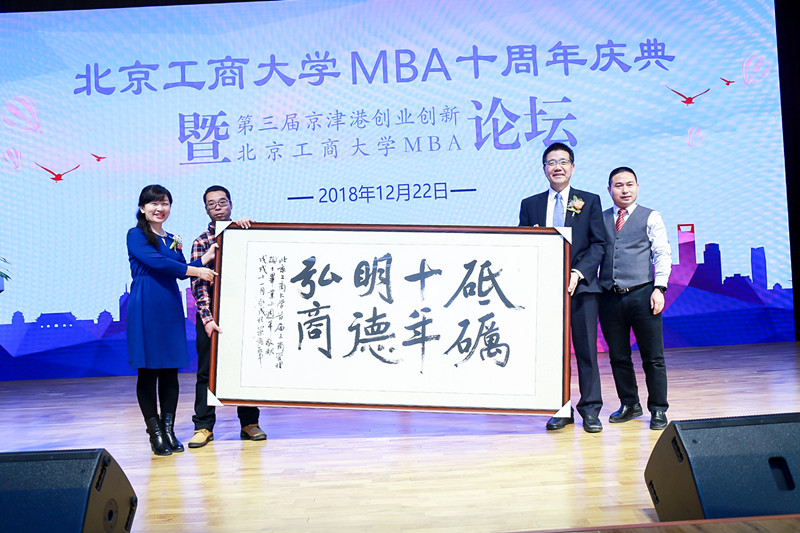 十年成长,反哺感恩。首届北工商MBA学员为赌博app下载 献礼牌匾,赌博app下载 院长王国顺、MBA教育中心执行主任王楠作为院校代表接受礼赠。