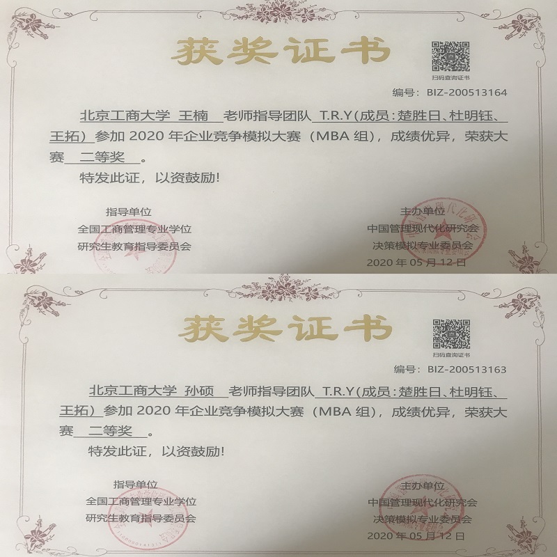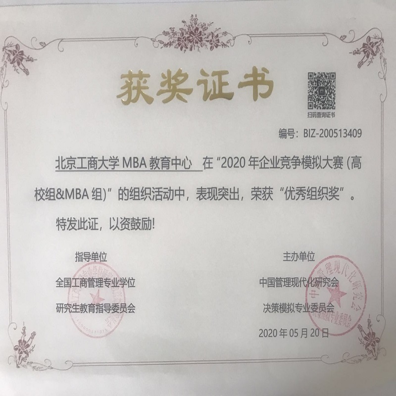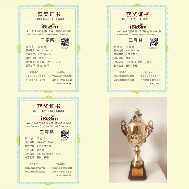 2020年企业竞争模拟大赛(高校组&MBA组)于3月份正式启动。经过初赛、复赛、半决赛、总决赛四轮比赛,于2020年5月10日圆满结束。此次参赛是赌博app下载 MBA教育中心首次自行组织参赛,在赌博app下载 参赛的七支MBA队伍中,共计荣获一个二等奖,两个三等奖,指导教师王楠、孙硕老师荣获优秀指导奖,北京工商大学MBA教育中心荣获优秀组织奖。