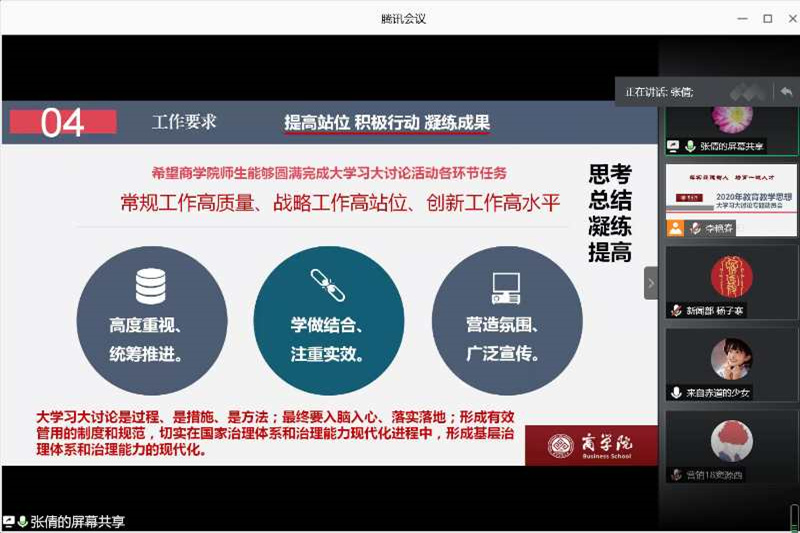 李艳春老师带大家领学了习近平总书记在纪念五四运动100周年大会上的讲话,并要求深入学习讲话精神,树立远大理想,坚定信念跟党走,发扬五四精神,绽放青春有所为。赵杰老师和寇明雯老师分别重点讲解了《研究生手册》和《学生手册》的规章制度,并要求各层组织要加强学风建设和诚信教育工作,营造积极向上的学习氛围,打造良好的育人环境,促进学生全面发展。辅导员郭建荣老师和李璐老师分别从学生能力的培养以及育人为本的角度出发,强调要抓落实,夯实党建基础,充分发挥“商梦花开”辅导班的优势,全面提升赌博app下载