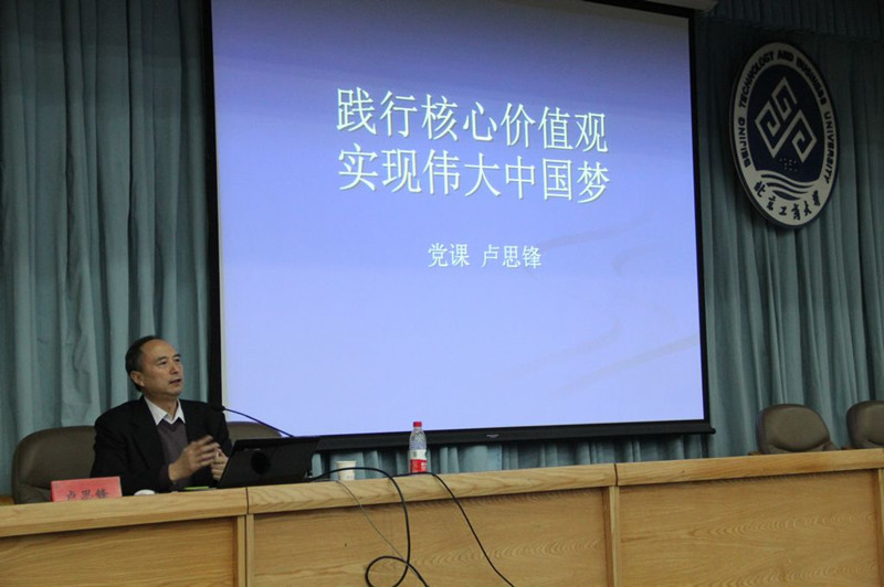 随后,校党委副书记卢思锋为大家上了第一堂党课——《践行核心价值观,实现伟大中国梦》,他从党中央习总书记对 “中国梦”的提出出发,通过古今对比,中外对比,以鲜活生动的例子和通俗易懂的语言阐明了个人梦与中国梦的关系,为大家深入讲解了“中国梦”的科学含义、时代特征、动力来源和实现途径,并鼓励大学生敢于做梦,敢于让梦成真,将个人的梦与国家的梦紧密联系在一起,共同实现习总书记所提出的中国梦。同时,卢书记还从中国的基本国情出发,为大家介绍了社会主义核心价值观的深刻内涵,并由此提出作为当代大学生应当如何从自身做起、从小事做起以践行社会主义核心价值观。他通过图片、数据及案例等形式让同学们从中学习党的基本理论知识,提高对国情、党情的基本认识。最后卢书记通过诙谐的漫画,让大家在轻松愉快的氛围中重新审视自己,重塑自己的价值观。