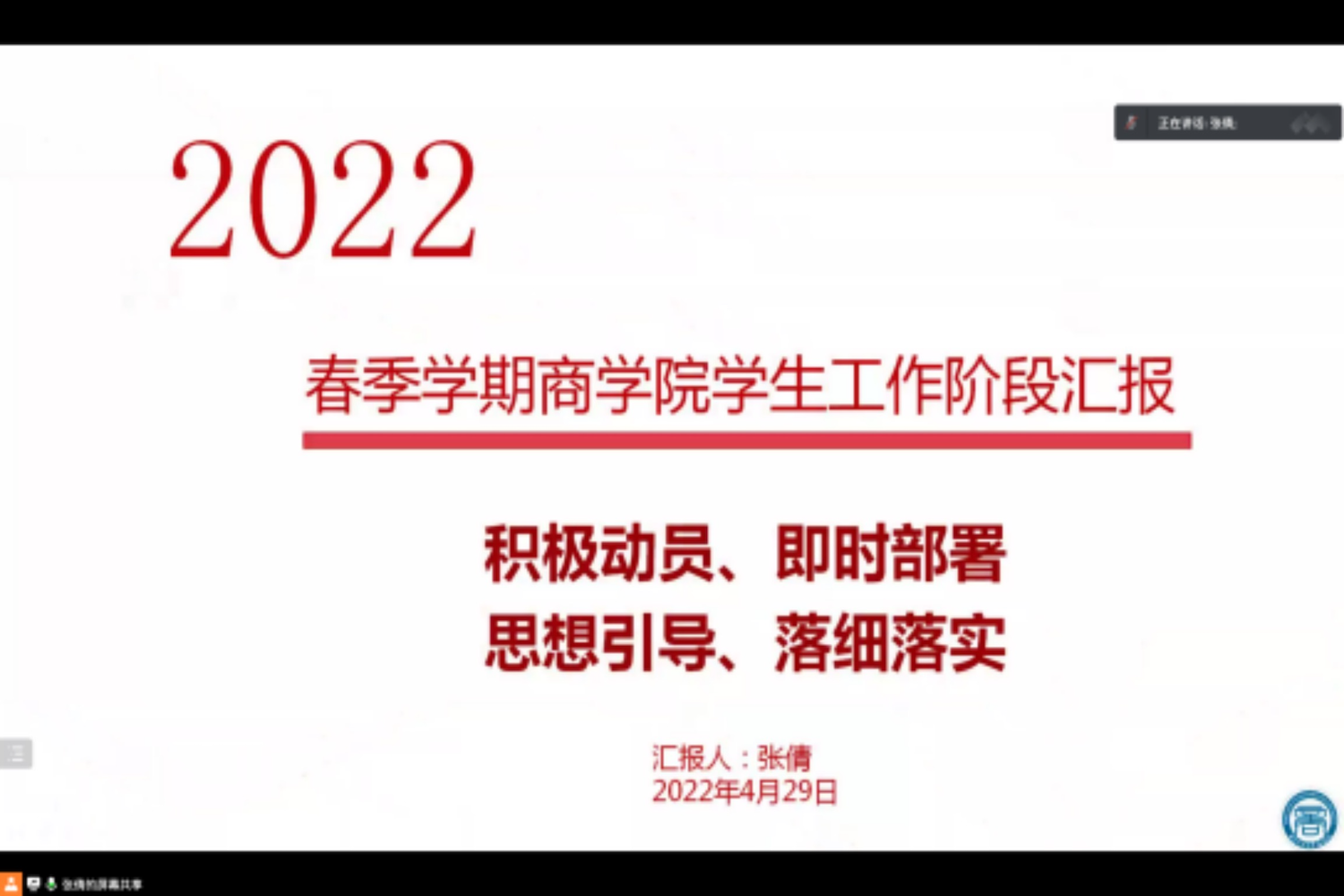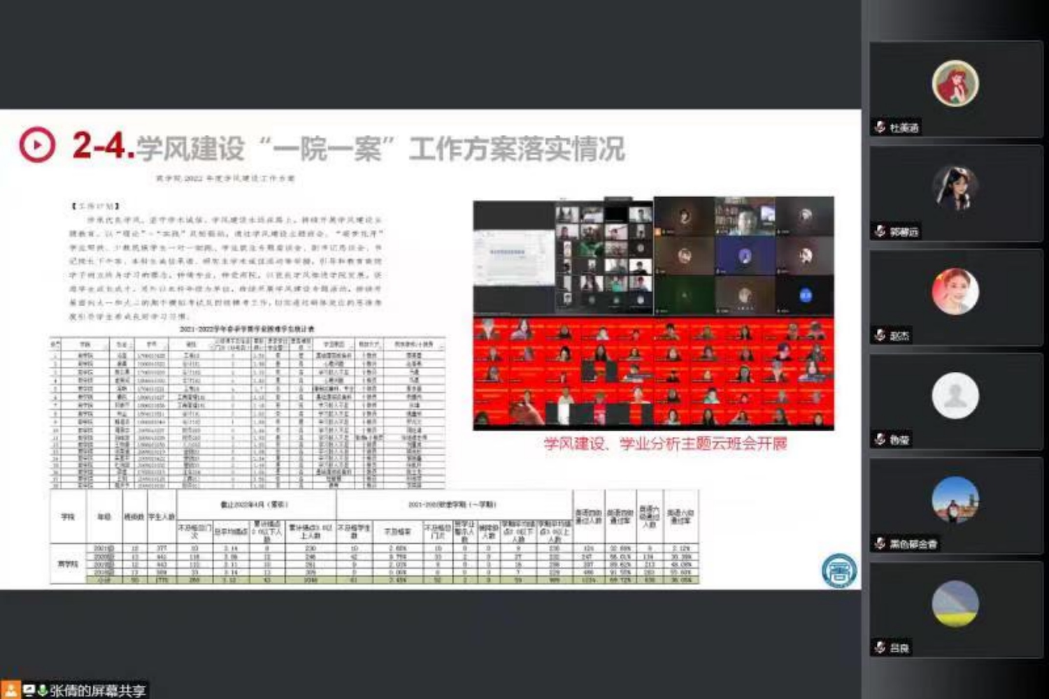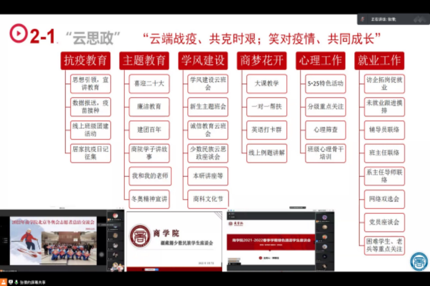 会上,赌博app下载 党委副书记张倩首先代表赌博app下载 对学生处莅临指导表示热烈欢迎,并对学生处长期以来对赌博app下载 学生工作的支持和指导表示感谢。之后,她结合赌博app下载 学工队伍长期以来形成的“积极动员、及时部署、思想引导、落细落实”的工作理念和思路进行专题汇报。她介绍了赌博app下载 学生的基本情况及学工队伍现状,随后围绕云思政工作计划及落实情况、重点关注学生工作开展情况、家庭经济困难学生档案与身份复查情况、学风建设“一院一案”落实情况、心理重点关注学生工作开展情况、学生疫情防控排查工作落实、研究生学术活动“一院一品”建设情况等七方面专项工作开展情况进行了汇报。之后介绍了赌博app下载 在外培生管理、家校协同等方面面临的问题,希望能够获得进一步的支持。之后辅导员老师们分别就学生线上学习的精神状态、副书记恳谈会开展情况、考研指导纵向交流活动、商梦花开学风传承示范基地建设等方面进行了补充汇报。