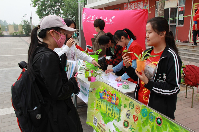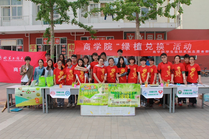 与北京理工大学延河之星志愿服务总队、首都师范大学爱心接力社和绿芽公益文化交流中心共同举办,在同一时间分别在北京工商大学良乡校区、北京理工大学良乡校区、首都师范大学良乡校区三地开展环保宣传活动。此次“绿色兑换·绿阳盈窗”活动共分为两个部分:绿植兑换与结缘绿植。其中,第一部分为活动的主体,同学们以废旧塑料瓶与废纸为兑换载体兑换新鲜的绿色植物。第二部分,通过领养相同编号的绿色植物种子让三所大学的同学互相沟通,增进友谊。
