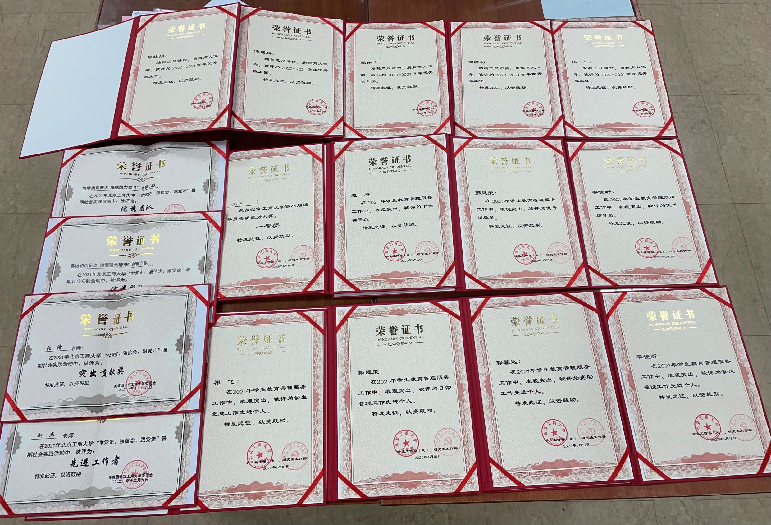 1、赵 杰:2017-2021年度北京高校优秀辅导员、北京工商大学2021年十佳辅导员、北京工商大学2021年暑期社会实践先进工作者