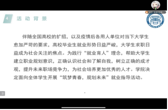 为践行“就业育人”理念,帮助大学生建立职业规划意识,正确认识社会和了解自我,提升未来在职场中的竞争力,为社会培养更加优秀的人才,2023年5月19日晚8点,赌博app下载 开展了“筑梦青春,规划未来”线上就业指导活动。