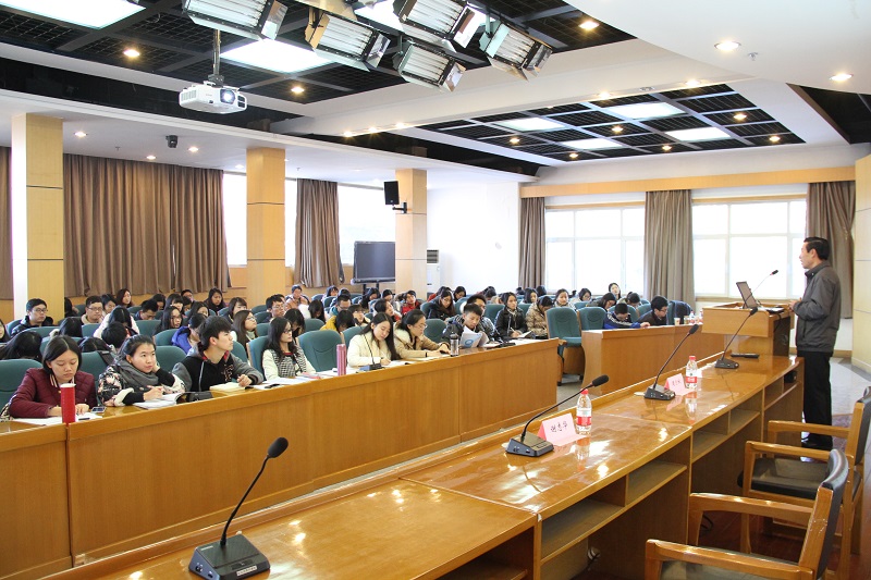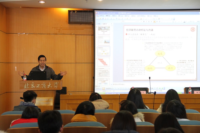 周月秋研究员首先从速度、动力、结构阐述了经济“新常态”内涵的特点,包括中国经济发展从高速增长转为中高速增长、经济结构不断优化升级、从要素驱动、投资驱动转向创新驱动等方面,他紧紧围绕着经济新常态的内涵和特点,从增速放缓与结构调整、一带一路、京津冀一体化、长江经济带、中国制造2025、商事制度改革、城镇化、互联网经济、金融政策九个方面阐述了这些经济事项的现实表现、与经济发展的关系、对经济发展的机遇和挑战等问题。周月秋博士在讲座中旁征博引、图文并茂、数据详实,结合实例及当前的国内外的经济背景、深入浅出的向在场的师生展现了一场生动精彩、理论联系实际的讲座,使在座师生加强了对我国宏观经济发展、区域发展、金融政策与当前经济态势的认识。最后,张月秋总经理还回答了部分老师和学生提出的一些问题,