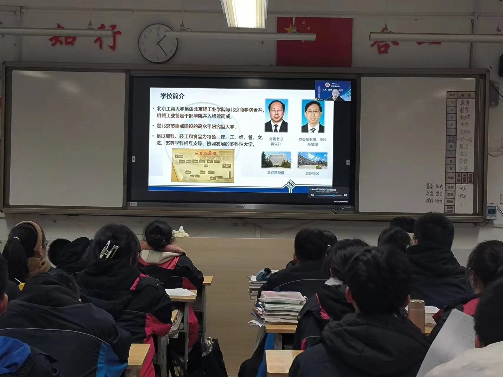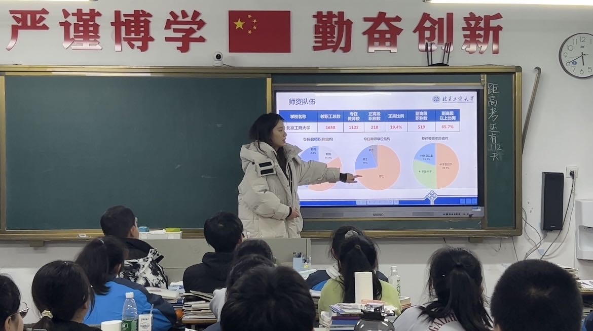 在开始宣讲之前,我先为学弟学妹们播放了北京工商大学的宣传视频,让他们对学校有了初步的了解。接着我从学校概况、特色专业、人才培养、招生政策、工商掠影等方面出发,详细向学弟学妹们介绍了我所就读的北京工商大学。在宣讲的过程中,我结合自身经历,和学弟学妹们表达了我在北工商就读三年的感受,以及作为过来学姐的经验和建议。
