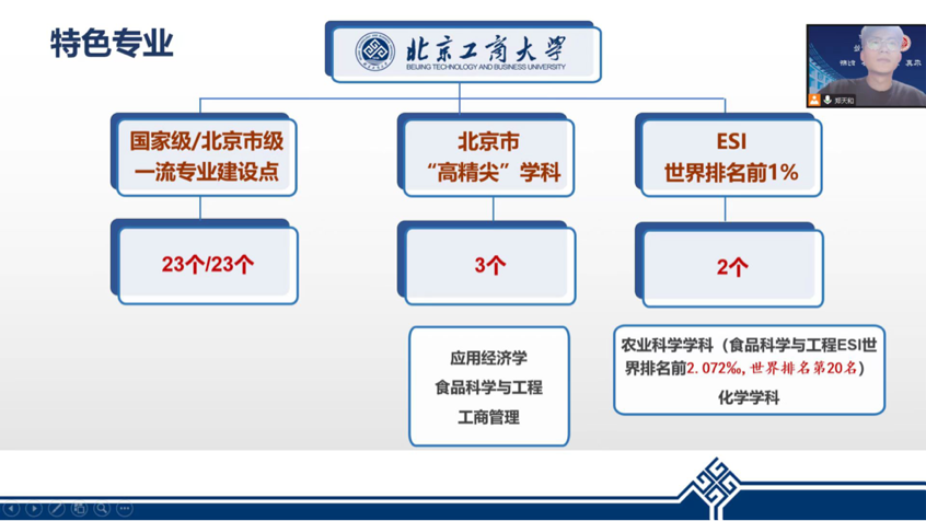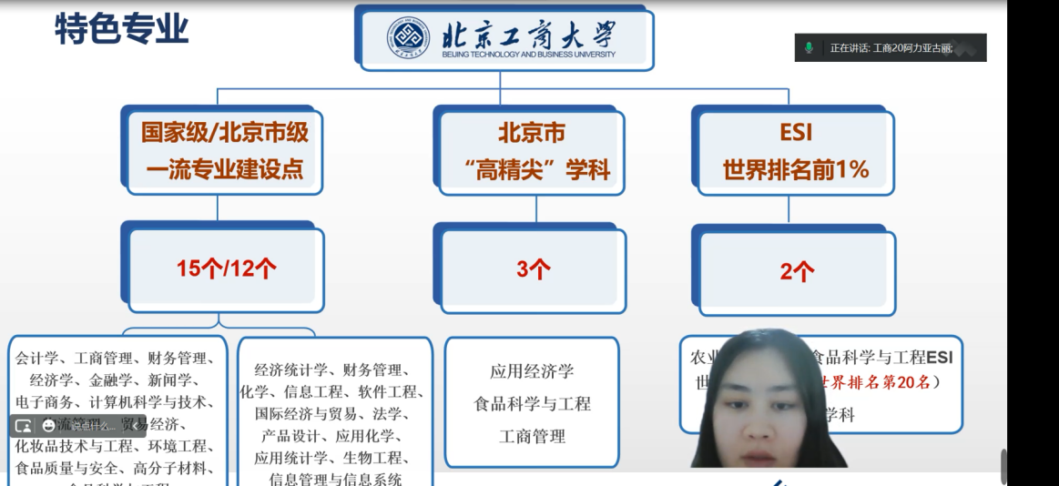 在宣讲视频中,我从学校概况和在校生活两方面向学弟学妹们分享介绍了北京工商大学的基本情况,较好的介绍了学校概况、学科特色、人才培养、招生政策。同时,我也很乐意进一步为学弟妹们报考北工商答疑解惑。