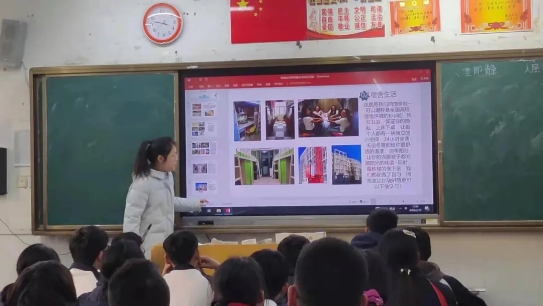 在正式开始宣讲前,我播放了2022年北京工商大学的招生宣传片,并在播放的过程中,向学弟学妹们分发了学校的招生章程及中性笔、招生宣传册、海报等纪念品。接下来,我从学校概况、特色专业、人才培养、招生政策、校园生活等方面来介绍北京工商大学及我的校园生活。在招生政策这一方面,我向同学们介绍了北工商2022年全国招生计划的分布情况和各专业录取分数情况,让大家对于招生政策有一个基本的了解。当然,他们更关心的是校园生活的丰富多彩,以及自我提升的空间和平台问题。我向他们展示了校园的景点,以及宿舍、医疗等情况。当我讲起北京工商大学丰富多样的社团和校园活动时,同学们的眼睛中饱含着对大学生活的憧憬与热情。从北工商出发,为梦想启航!相信“把我的大学带回家乡”这一活动,能够吸引越来越多的学子来到北京工商大学,在四年的大学生活里,活出自己的精彩!