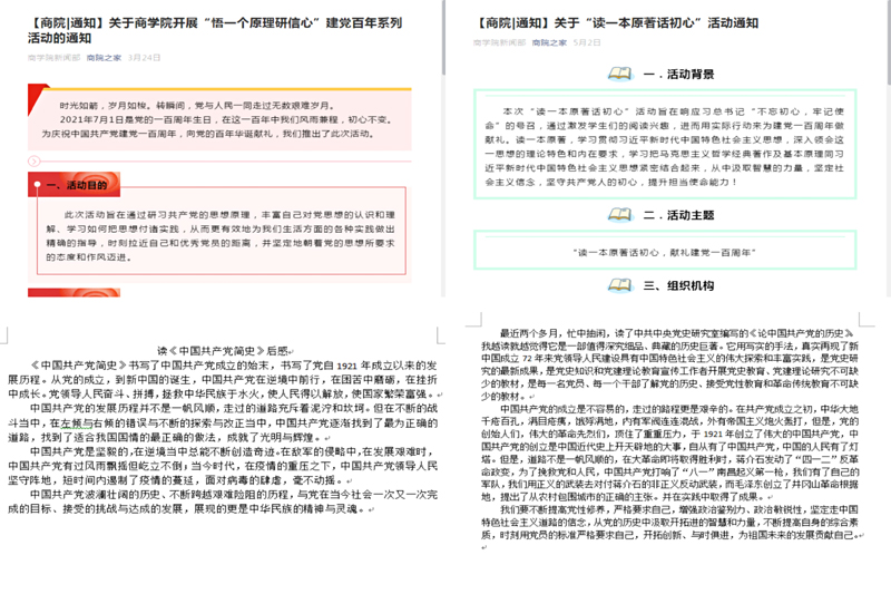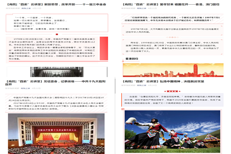 为积极响应习近平总书记关于深入学习党史、新中国史、改革开放史、社会主义发展史的号召,赌博app下载 开展了学习“四史”系列活动。通过“商院之家”公众号定期推送发布“四史”知识学习文章,目前已经发布14期,内容包括党的成立、开国大典、中苏建交、党的十九大会议、抗击疫情、脱贫攻坚等,引导同学们深刻认识到了新中国和中国特色社会主义来之不易,了解中国共产党先进的政治属性、崇高的政治理想、高尚的政治追求和纯洁的政治品质。