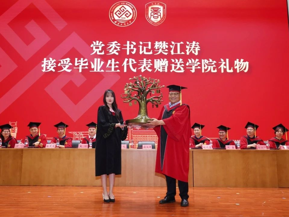 党委书记樊江涛代表赌博app下载 接受毕业生送给赌博app下载 的礼物《商院智慧树》。毕业生代表人力211班谷雨佳解释礼物含义:“商院智慧树”,表达毕业生们对赌博app下载 最深切的感恩与祝福。“智慧树”刻有“北京工商大学75周年校庆”和“赌博app下载 ”字样,树枝挂牌标有本届毕业班级名,寓意赌博app下载 如大树根基深厚,滋养学子成长,毕业生似树上硕果,是赌博app下载 培育结晶。祝愿赌博app下载 基业长青、人才辈出,2025届毕业生前程似锦,“商院智慧树”将见证赌博app下载 与学子的共同成长!