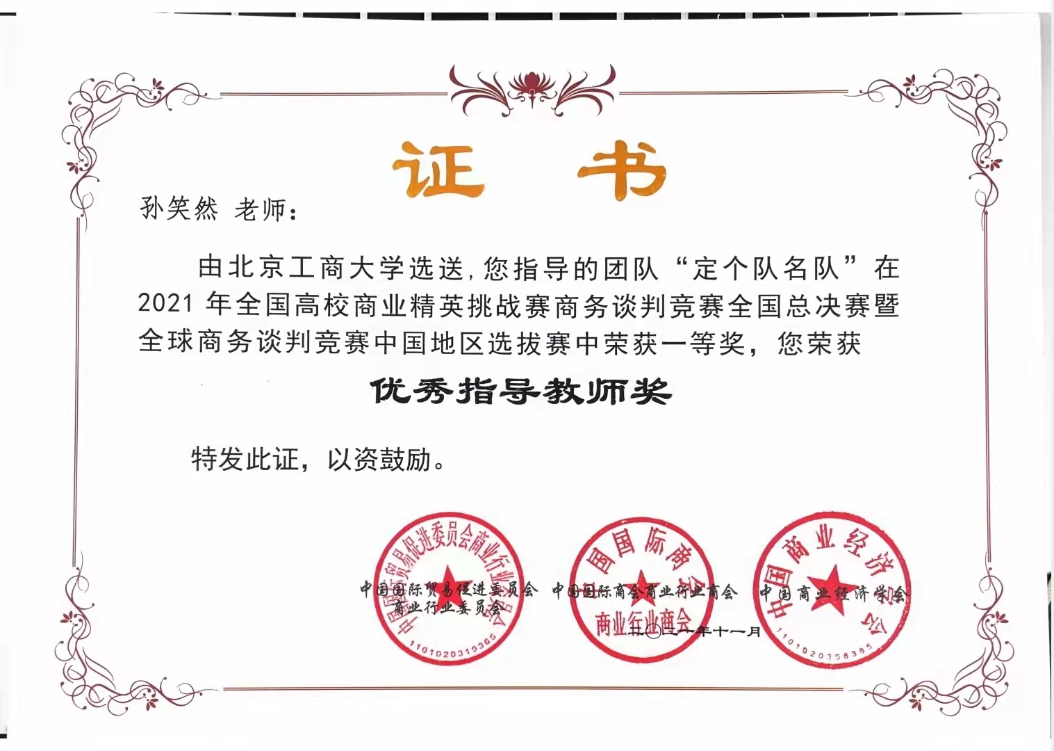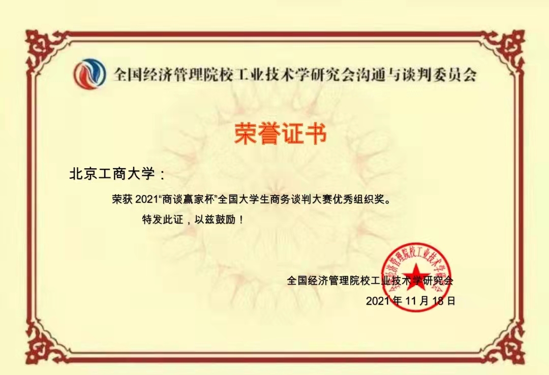 2021年6月-11月,北京工商大学商务谈判队组队参加了多项商务谈判竞赛的全国赛事。在赌博app下载 和经济赌博app下载 的大力支持下,我校学生共组成8支队伍,分别参加了“商谈赢家杯”2021全国大学生商务谈判全国赛和2021年全国高校商业精英挑战赛商务谈判竞赛,由赌博app下载 孙笑然、王楠、孙百惠,经济赌博app下载 朱振荣、王茜共同担任指导老师,在两项比赛中共获得3个一等奖,3个二等奖和2个三等奖。北京工商大学同时也获得“商谈赢家杯”最佳院校组织奖和“精英挑战赛”优秀组织奖。