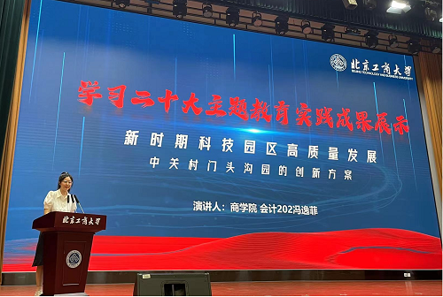 会计202班冯逸菲同学作为“挑战杯”获奖学生代表汇报学习二十大主题教育优秀成果。在汇报中,她介绍了所在团队开展的《新时期科技园区高质量发展——中关村门头沟园创新方案》的实践成果。该成果获得了“青创北京”2023年“挑战杯”首都大学生课外学术科技作品竞赛“青砺基层”专项赛特等奖和“播主”的最高荣誉称号,刷新了学校在该竞赛的获奖记录,并将接受《北京日报》的采访。