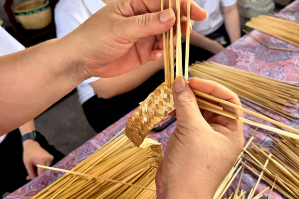 大名草编是一种传统民间家庭编结手工艺,2008年被列入第二批国家级非物质文化遗产名录。在大名草编国家级传承人王群英的指导下,实践团成员沉浸于草编研学体验区。他们亲手学习七股辫、五角星编织技法,用镜头记录秸秆蜕变为艺术品的全过程,深度访谈原料供应、商业模式与传承困境。面对学员老龄化、回报周期长等痛点,团队提出 “直播教学+短视频引流”数字化解决方案,力图通过抖音课堂吸引年轻群体学习草编技艺,为古老非遗注入新活力。