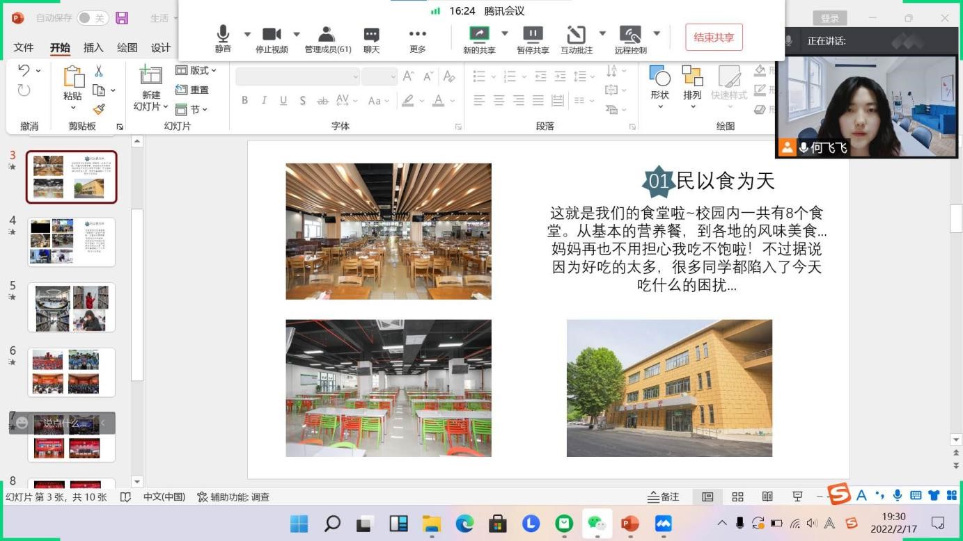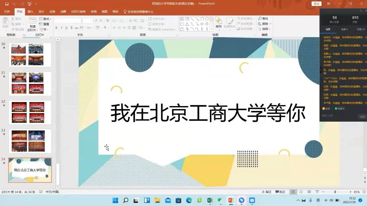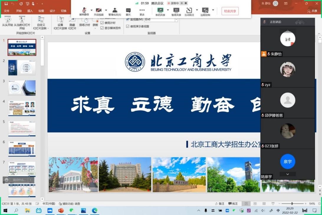 2022年的寒假,我回到了那个充满回忆的高中母校——宁夏银川市第九中学,向我的学弟学妹们介绍我的另一个母校,分享我的学习经验和我精彩的大学生活,以此来鼓舞大家。由于疫情原因,我以线上腾讯会议的方式开展了此次活动。我向大家讲解了北京工商大学的发展历程、学校的特色专业、师资力量等。