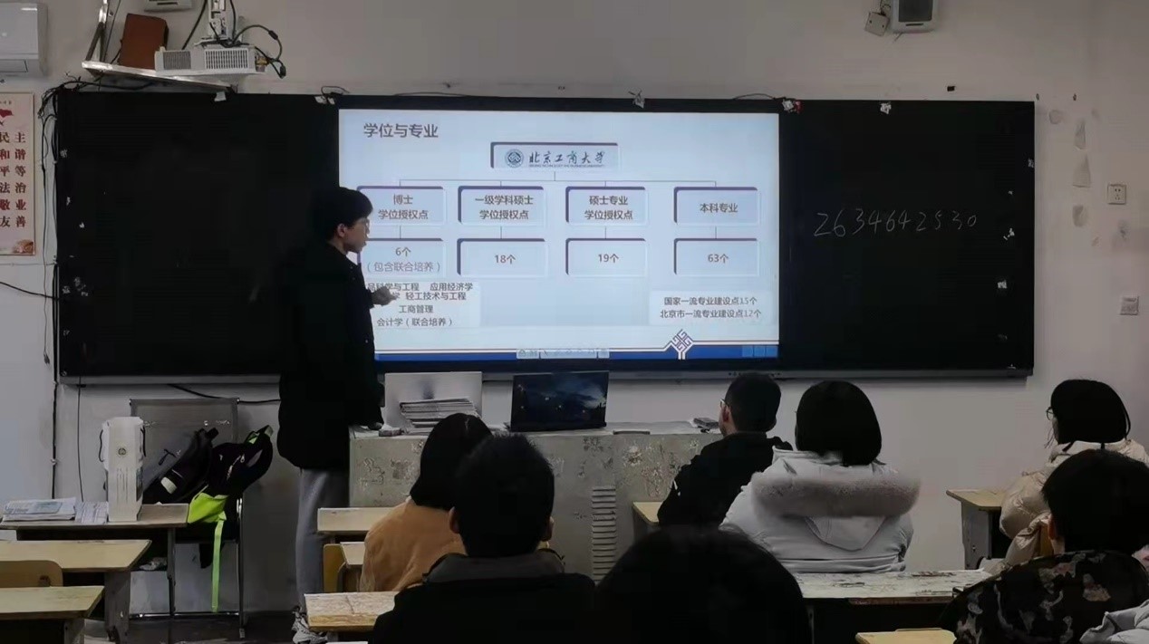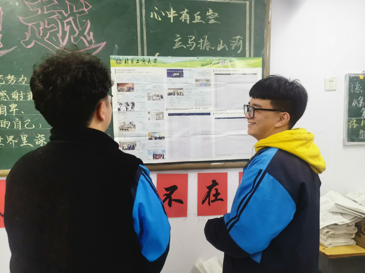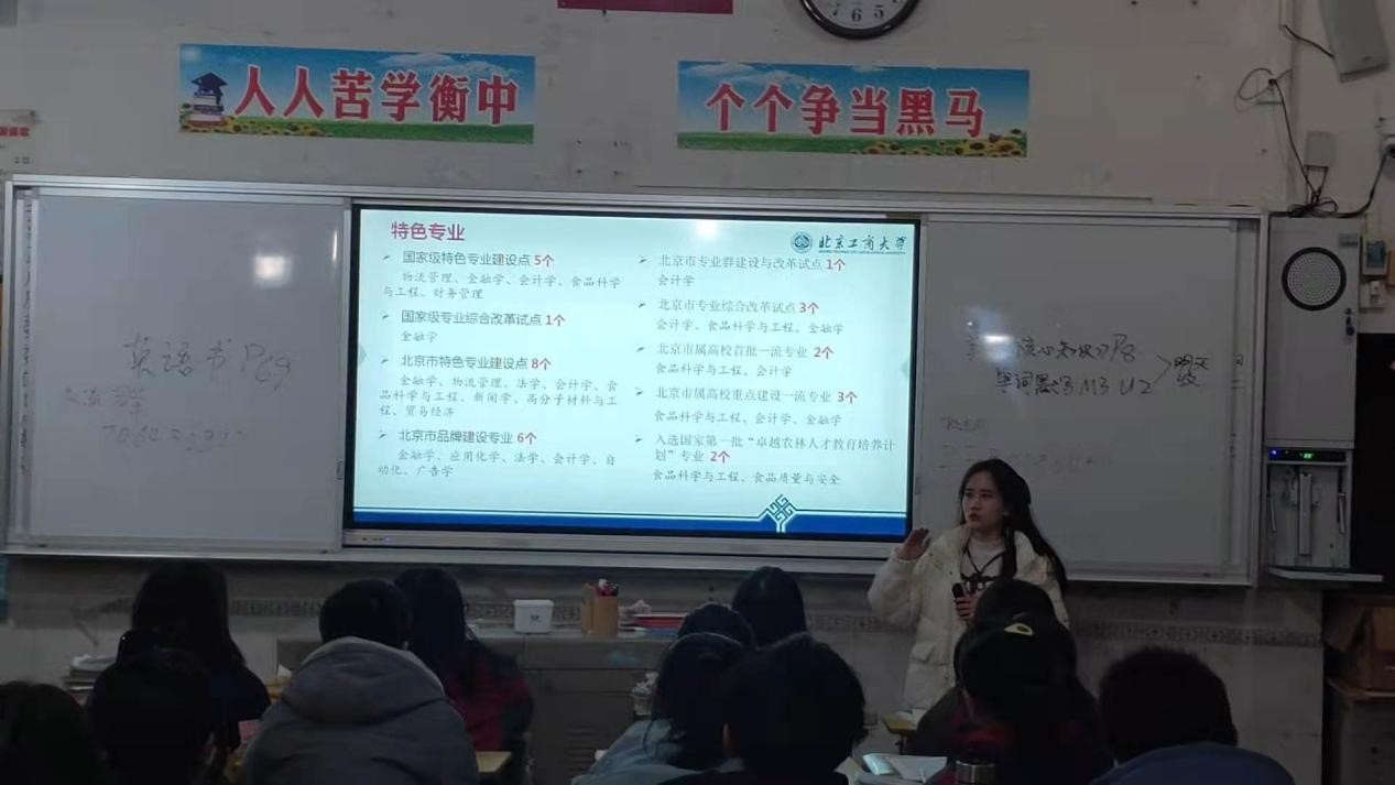 在正式开展宣讲活动前,我与老师为大家分发了学校的招生章程,印有学校logo的笔,日历卡等纪念品。我从学校概况、特色专业、人才培养、招生政策、校园风景等方面出发,详细向学弟学妹们介绍了我所就读的北京工商大学。并从自身就读专业出发,讲解了我在学校里的所学、所知、所感。宣讲过程中同学们聚精会神,眼神里充满了对于大学生活的向往与憧憬。