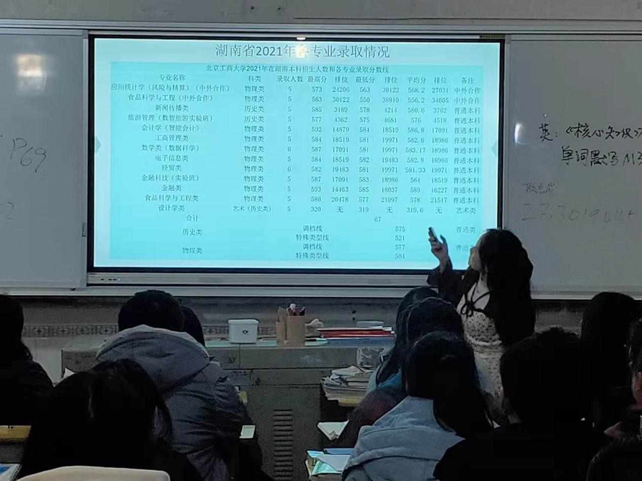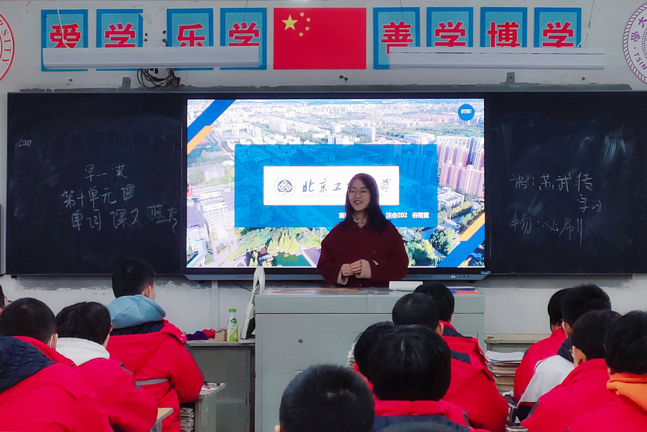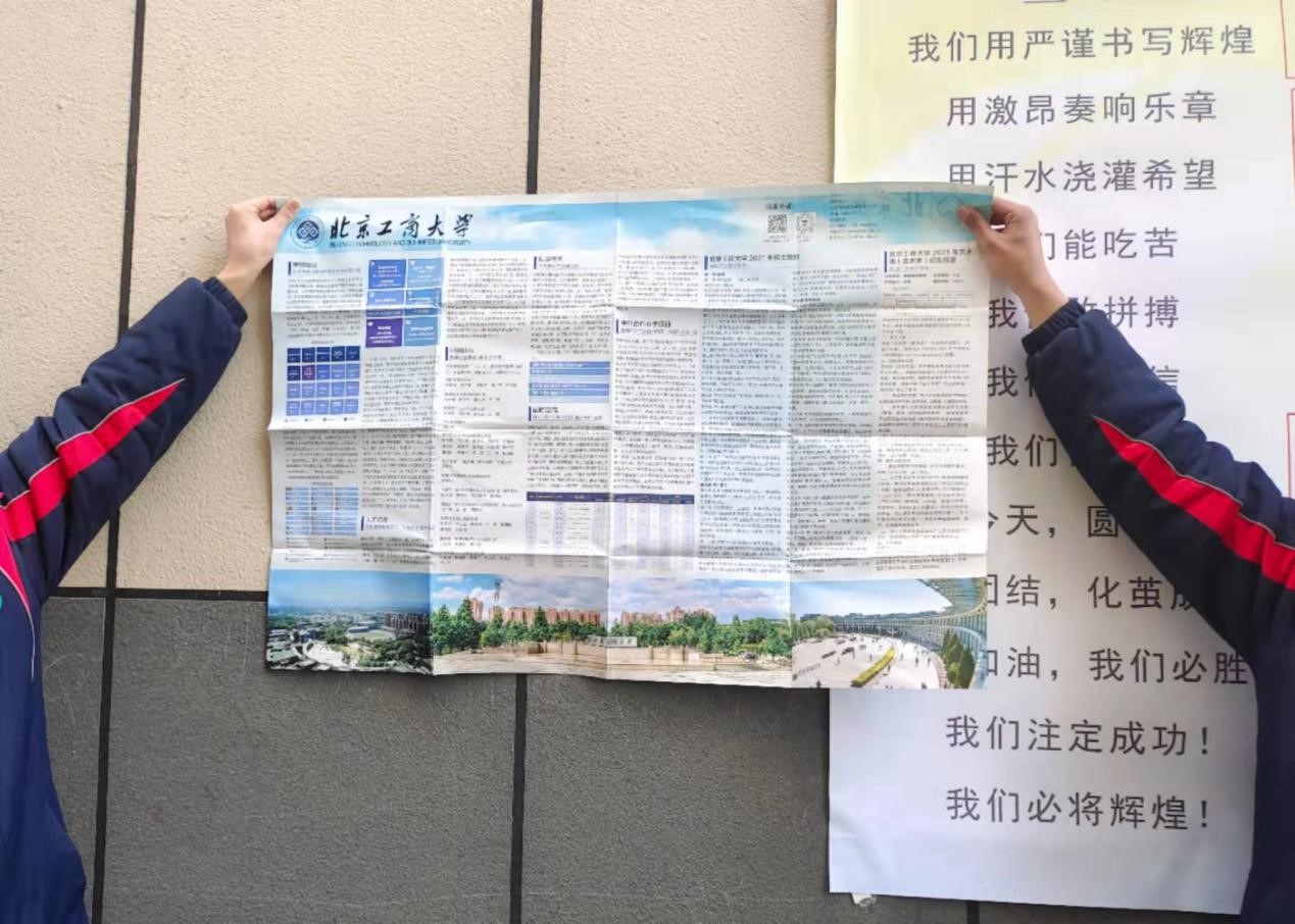 在正式开展宣讲活动前,我与老师为大家分发了学校的招生章程,印有学校logo的笔,日历卡等纪念品。我从学校概况、特色专业、人才培养、招生政策、校园风景等方面出发,详细向学弟学妹们介绍了我所就读的北京工商大学。并从自身就读专业出发,讲解了我在学校里的所学、所知、所感。宣讲过程中同学们聚精会神,眼神里充满了对于大学生活的向往与憧憬。