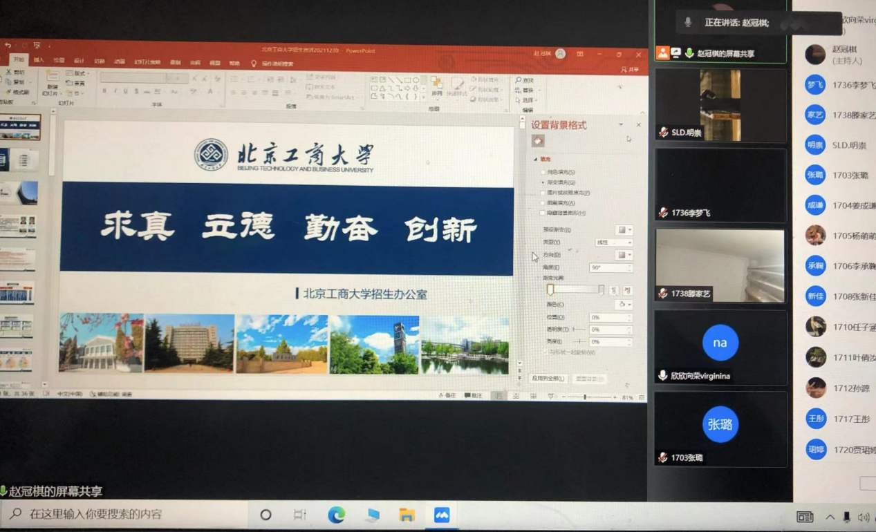 第二阶段,因为疫情和寒假的原因,我在线上为学弟学妹们进行宣讲。我通过宣传视频,招生宣传PPT,结合自身在校学习、生活情况,向学弟学妹们详细地介绍了北京工商大学的历史沿革、办学宗旨、办学成就、特色专业、师资力量、人才培养方案、招生政策、校园环境、在校生活、学生社团活动等方面。我结合自身参加的学校活动,以及自我提升的学习状况,引起了学弟学妹们对于大学生活的美好憧憬。通过这次宣讲活动,学弟学妹们对于北京工商大学产生了很高的报考热情。