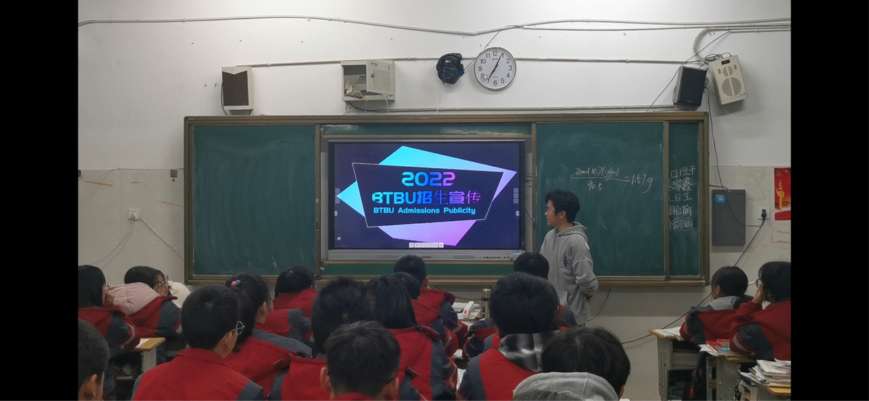 经过前期准备,我先用多功能化的智能黑板,放映了一段招生视频,并在播放时,向学弟学妹们分发了北京工商大学的资料以及钢笔、半年历、便利贴等纪念品。通过这短短三分钟的视频以及详细的资料,让学弟学妹们对北京工商大学有了初步的了解。然后我继续介绍了北工商学校里的美丽景色、学校里配置的教学资源和基础设施还有同学们最关心的饮食、住宿、医疗等问题。大家都对大学生活十分向往,眼神中藏不住的喜悦,已经开始想象美好的大学生活了。我的宣讲也在这样快乐的氛围中结束了,我很自豪能代表北工商,也希望更多的学弟学妹来报考北京工商大学。