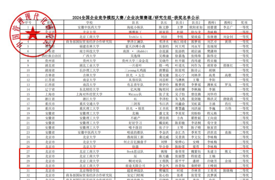经校赛、全国半决赛的激烈角逐后,来自北京大学、浙江大学、南京大学以及吉林大学等高校的22支研究生队伍晋级企业决策赛道的全国总决赛,在暨南大学珠海校区进行历时一天的激烈比拼。最终,我校代表荣获全国一等奖1项、二等奖4项、三等奖2项,北京工商大学荣获最佳组织奖1项。