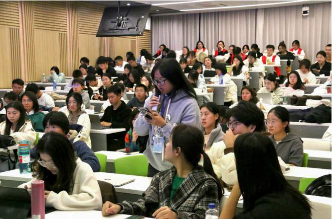 分享环节结束后,本次讲座便步入了氛围热烈的互动问答阶段。同学们热情高涨,纷纷踊跃举手提问。到场同学从项目构思、技术能力到团队管理等各个方面,向老师询问困扰他们的疑难竞赛问题。叶老师⼀⼀耐心解答,用她的经验与智慧为同学们指点迷津。