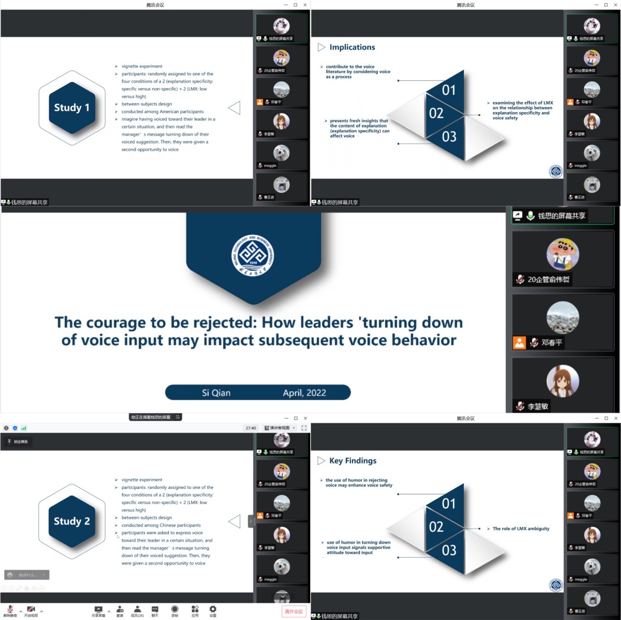 钱思博士围绕研究背景、研究思路、研究内容等方面,详细阐释了领导视角下员工建言未被采纳后的心理作用机制以及影响员工后续建言因素的两项学术研究成果。基于将员工建言视为一个过程的重要前提下,该研究分别从“领导给出具体解释”及“领导幽默回应”这两个角度深入探索,研究发现若领导给出未采纳员工建言的具体解释或者以一种幽默的方式回应会提升员工建言安全感,从而增强其后续建言意愿。该研究成果不仅结合多种研究方法收集并筛选可靠样本数据体现了较强的理论意义,而且其研究背景与实际管理场景高度契合,为领导如何激发员工后续建言的管理问题提供了实践指引。